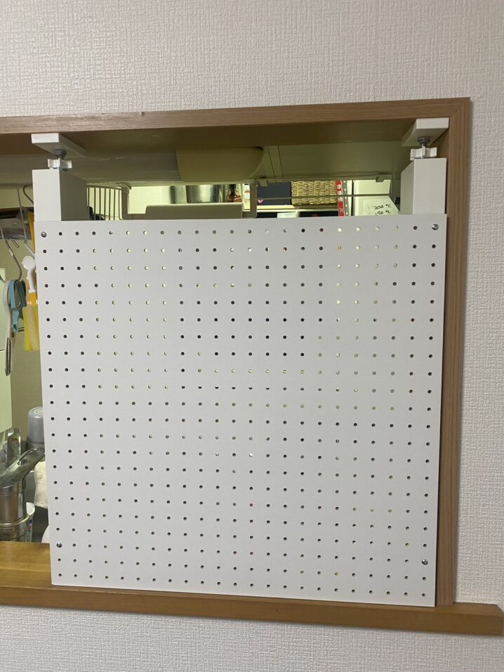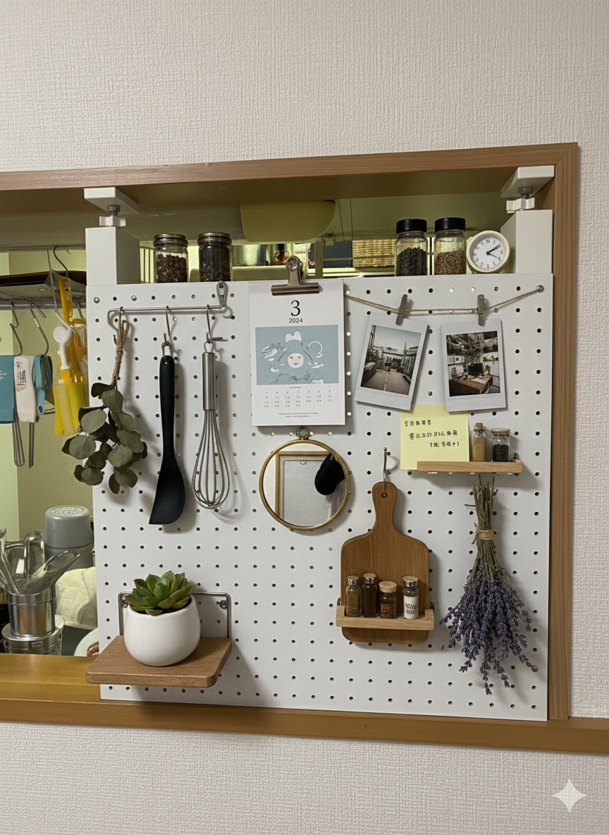 棚の背面に有孔ボードを取り付けたことで、キッチン側だけでなく、反対側(リビング側など)もフックやミニ棚として活用できる**「両面収納」**が完成しました。