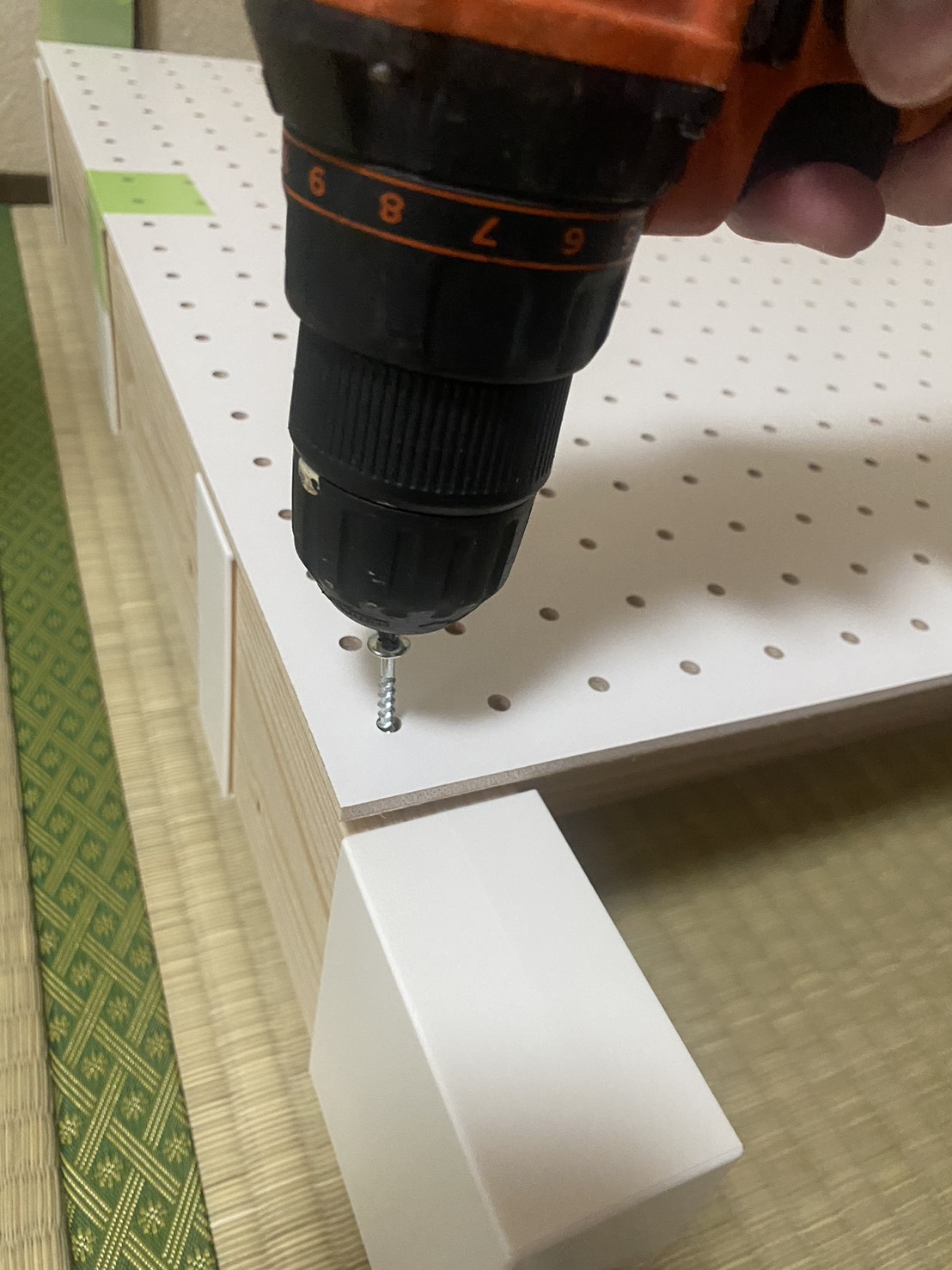 今回は、棚板取り付け時に余ったラブリコ付属のネジを、有孔ボードの固定に再利用しました。